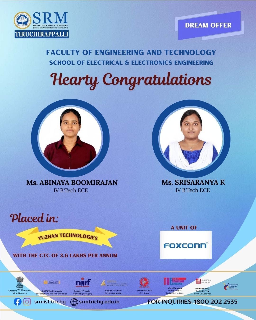 We are proud to share that our students Ms. Abinaya Boomirajan and Ms. Srisaranya K, final-year ECE students of SRM Institute of Science and Technology, Tiruchirappalli, have been placed in Yuzhan Technologies, a unit of Foxconn, with an impressive CTC of 3.6 LPA. Your hard work, dedication, and perseverance have truly paid off! Wishing you continued success in all your future endeavors.