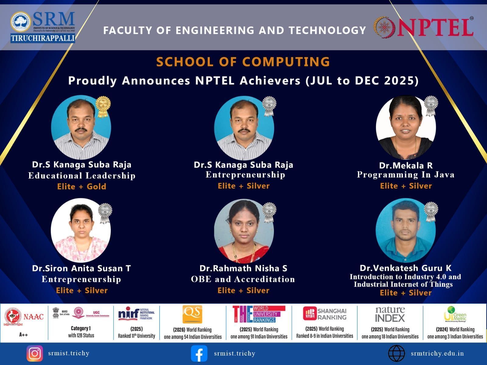 A Proud Academic Milestone for the School of Computing, SRM Institute of Science and Technology – Tiruchirappalli The Faculty of Engineering and Technology – School of Computing, SRM Institute of Science and Technology, Tiruchirappalli proudly celebrates the remarkable achievements of our faculty members who have earned prestigious NPTEL Elite + Gold and Elite + Silver certifications during the July–December 2025 session. These accomplishments stand as a testament to their unwavering commitment to continuous learning, academic excellence, and professional growth, reinforcing our institution’s dedication to quality education and innovation. 🎓 Heartiest Congratulations to Our Esteemed Achievers: 🔹 Dr. S. Kanaga Suba Raja, Associate Dean, School of Computing – Education (Elite + Gold) 🔹 Dr. S. Kanaga Suba Raja – Entrepreneurship (Elite + Silver) 🔹 Dr. Mekala R – Programming in Java (Elite + Silver) 🔹 Dr. Siron Anita Susan T – Entrepreneurship (Elite + Silver) 🔹 Dr. Rahmath Nisha S – OBE and Accreditation (Elite + Silver) 🔹 Dr. Venkatesh Guru K – Introduction to Industry 4.0 & Industrial Internet of Things (Elite + Silver) Such achievements not only elevate the academic culture of the School of Computing but also inspire our students and peers to pursue excellence and lifelong learning. Congratulations once again to all our achievers for making SRM IST proud!