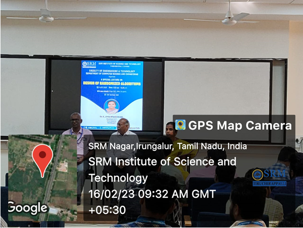 The Department of CSE & CSE-AIML, Faculty of Engineering & Technology, SRMIST, Tiruchirappalli Campus conducted a Special Lecture for our B.Tech II Year CSE & CSE-AIML Students on “Design of Randomized Algorithms” at our IST Seminar Hall on 16.02.2023 from 9.00 AM to 12.30 PM. The Session was handled by Dr. K. Uma Maheshwari, Department of IT, Anna University, Tiruchirappalli.