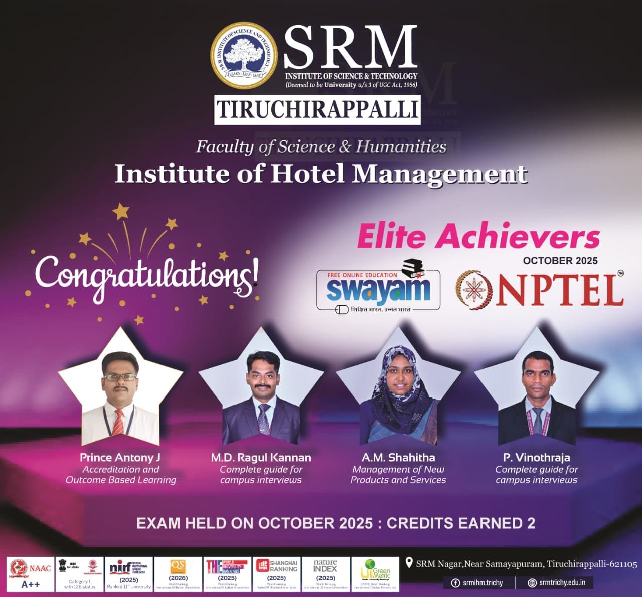 The Institute of Hotel Management, SRM IST Tiruchirappalli, proudly recognizes the outstanding performance of our faculty members who have successfully completed NPTEL/SWAYAM courses and earned Elite status in the October 2025 examinations. Their dedication to continuous learning and academic excellence reflects the institution’s commitment to quality education and professional growth. Congratulations to all achievers for setting a strong benchmark in lifelong learning and inspiring the academic community.
