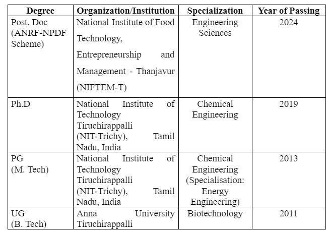 SERB- National Postdoctoral Fellow (N-PDF), National Institute of Food Technology, Entrepreneurship and Management - Thanjavur (NIFTEM-T), Thanjavur, Tamil Nadu, India (02.02.2022 to 01.02.2024)