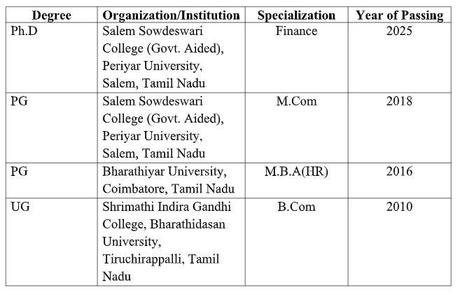 Serving as Assistant Professor in the Department of Commerce, SRM Institute of Science and Technology, Tiruchirappalli from May 2025 to Till date