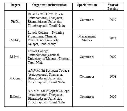 Served as Lecturer, Department of Commerce, Poonga College Chennai, from June 2010 to May 2011