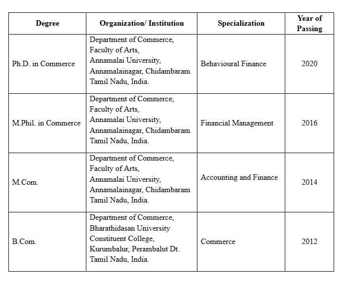 Assistant Professor in Commerce, Faculty of Humanities, Sciences and Management, Periyar Maniammai Institute of Science and Technology, Periyar Nagar, Vallam, Thanjavur, Tamil Nadu. (05/10/2020 to 23/12/2022)