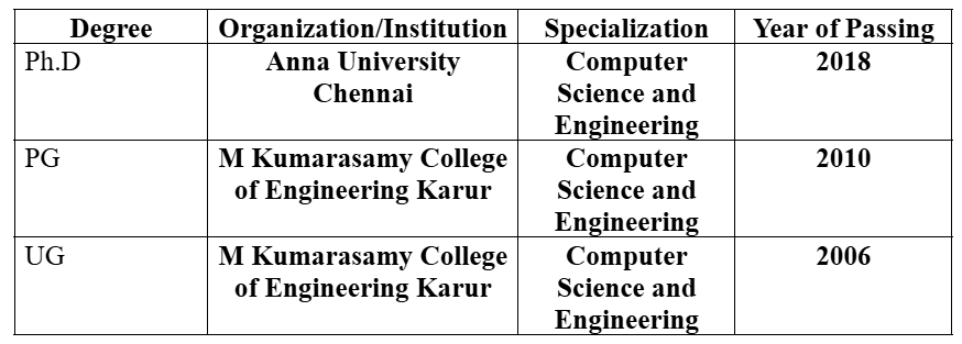 Worked as a Assistant Professor Department of CSE from June ‟10 to July2018. M.Kumarasamy College of Engineering,Thalavapalayam, Karur-639113