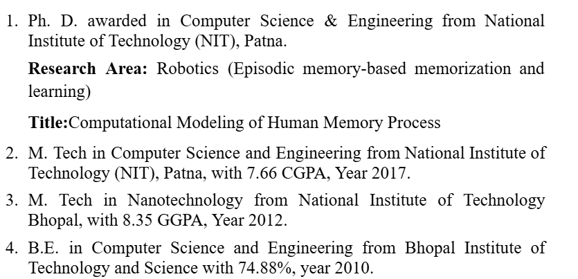 - 9 months of experience as an Assistant Professor in the Department of CSE, Maulana Azad National Institute of Technology Bhopal (NIT Bhopal).