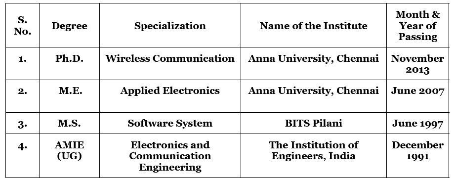 Professor, Department of Electronics and Communication Engineering, SRM Institute of Science and Technology Tiruchurappalli, June 2024 to Till Date