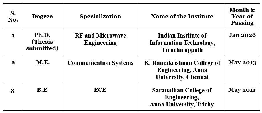 ● Assistant Professor, Department of ECE, SRM Institute of Science and Technology, Tiruchirappalli, Tamil Nadu, (Feb 2026 –Till date).