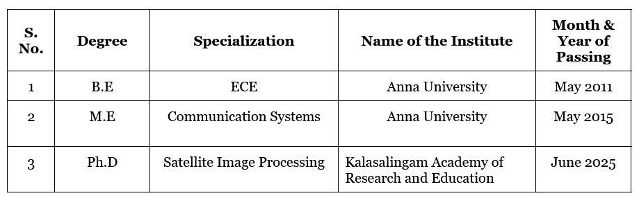 Part time Research Scholar,Department of ECE, KalasalingamAcademy of Research and Education, KrishnanKovil, Tamil Nadu (June, 2022 onwards).
