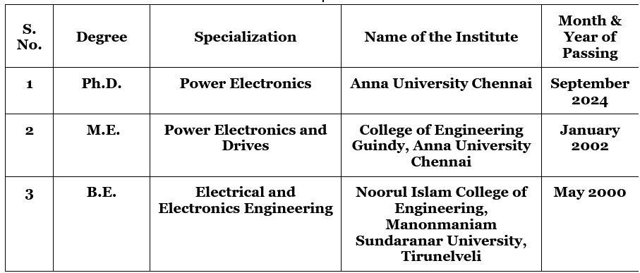● Associate Professor, Department of EEE, SSN College of Engineering, Chennai, Oct. 2014 to May 2024.