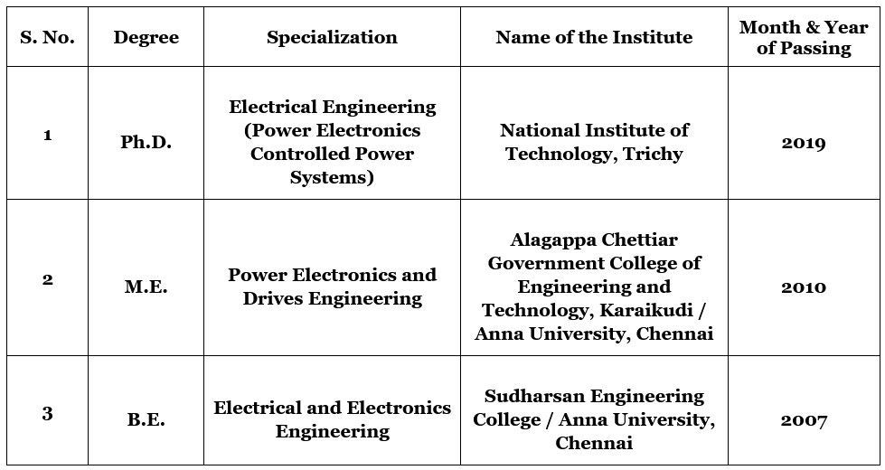 - Associate Professor, Department of Electrical and Electronics Engineering, SRM Institute of Science and Technology Tiruchirappalli, (June 2024 – Till date)