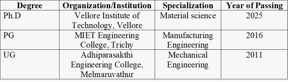 - Full time research scholar, Department of Manufacturing Engineering, School of Mechanical Engineering, Vellore Institute of Technology, Vellore, Tamilnadu (December 2021 – December 2024)