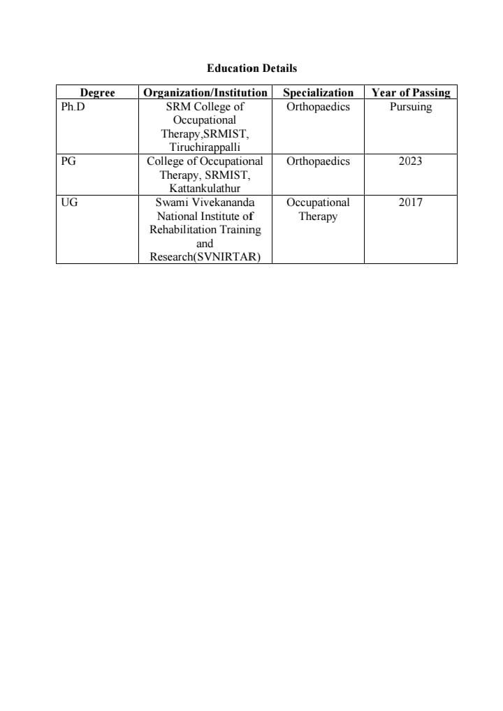 ● Assistant Professor,SRM College of Occupational Therapy,SRMIST,Tiruchirappalli, Tamilnadu (Oct 2023 – till date)