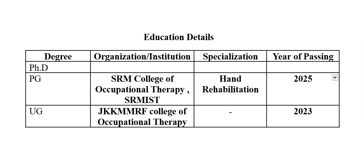 Assistant Professor - Department of Occupational Therapy, Faculty of Medical and Health Sciences, SRM Institute of Science and Technology (SRMIST), Trichy - from 14-07-2025