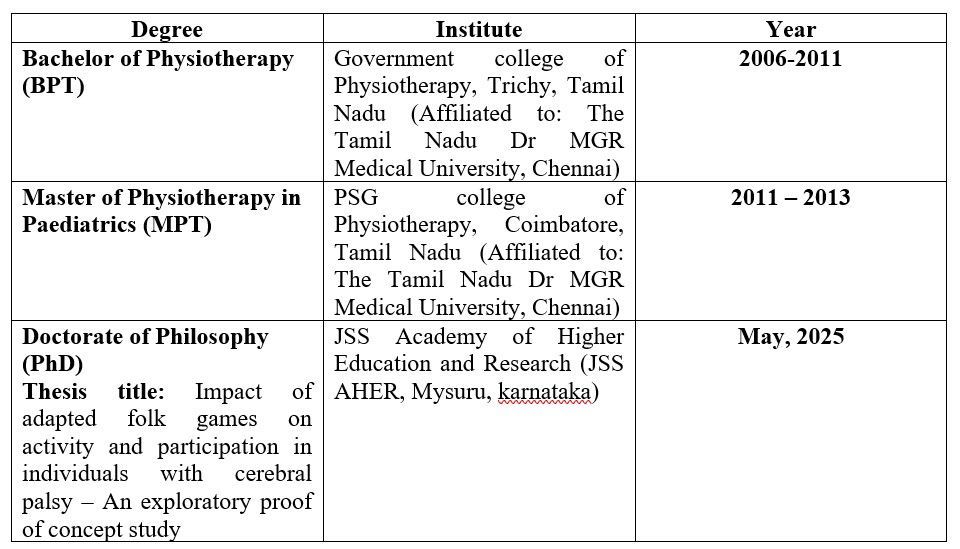 - Associate Professor, SRM IST – College of Physiotherapy, Trichy Campus, SRM University (05 January 2026 – Present).