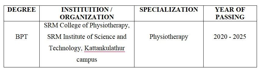 Clinical physiotherapist , working in SRM hospital and Research centre 30th of June 2025 to till date