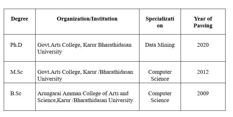 - Assistant Professor from 18/06/2018 to 24/10/2019 in Asan College of Arts and Science, Karur-03.
