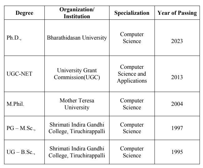 ⮚ Served as Assistant Professor in the Department of Computer Science, Shrimati Indira Gandhi College, Tiruchirappalli from June 2001 to October 2019.