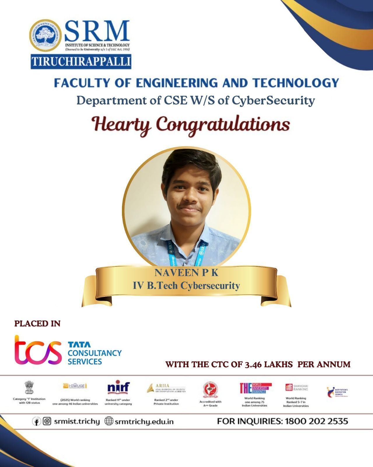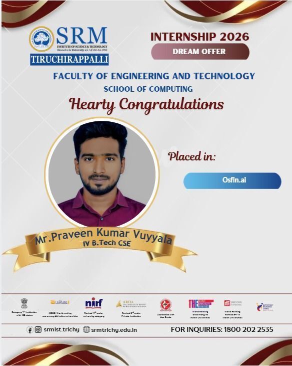 We are delighted to share that Mr. Naveen P K, Final year B.Tech Cybersecurity student has been successfully placed at Tata Consultancy Services with a CTC of 3.46 LPA. This achievement reflects his dedication, consistency, and strong academic performance, truly embodying the values and academic excellence of SRMIST Tiruchirappalli. We wish him continued success and growth as he embarks on his professional journey.