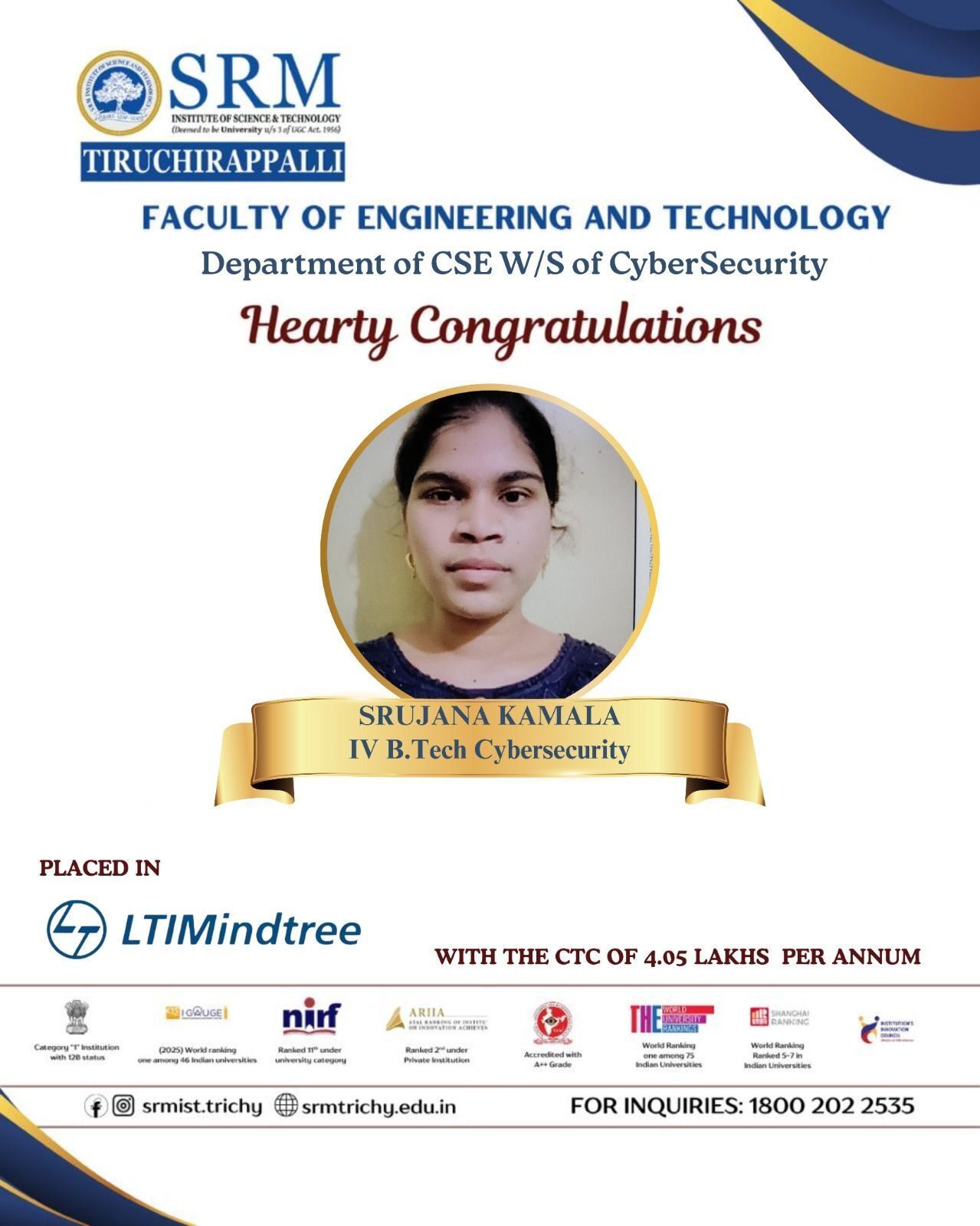 We are delighted to share that Ms. Srujana Kamala, Final year B.Tech Cybersecurity student has been successfully placed at LTIMindtree with a CTC of 4.05 LPA. This achievement reflects her dedication, consistency, and strong academic performance, truly embodying the values and academic excellence of SRMIST Tiruchirappalli. We wish her continued success and growth as she embarks on her professional journey