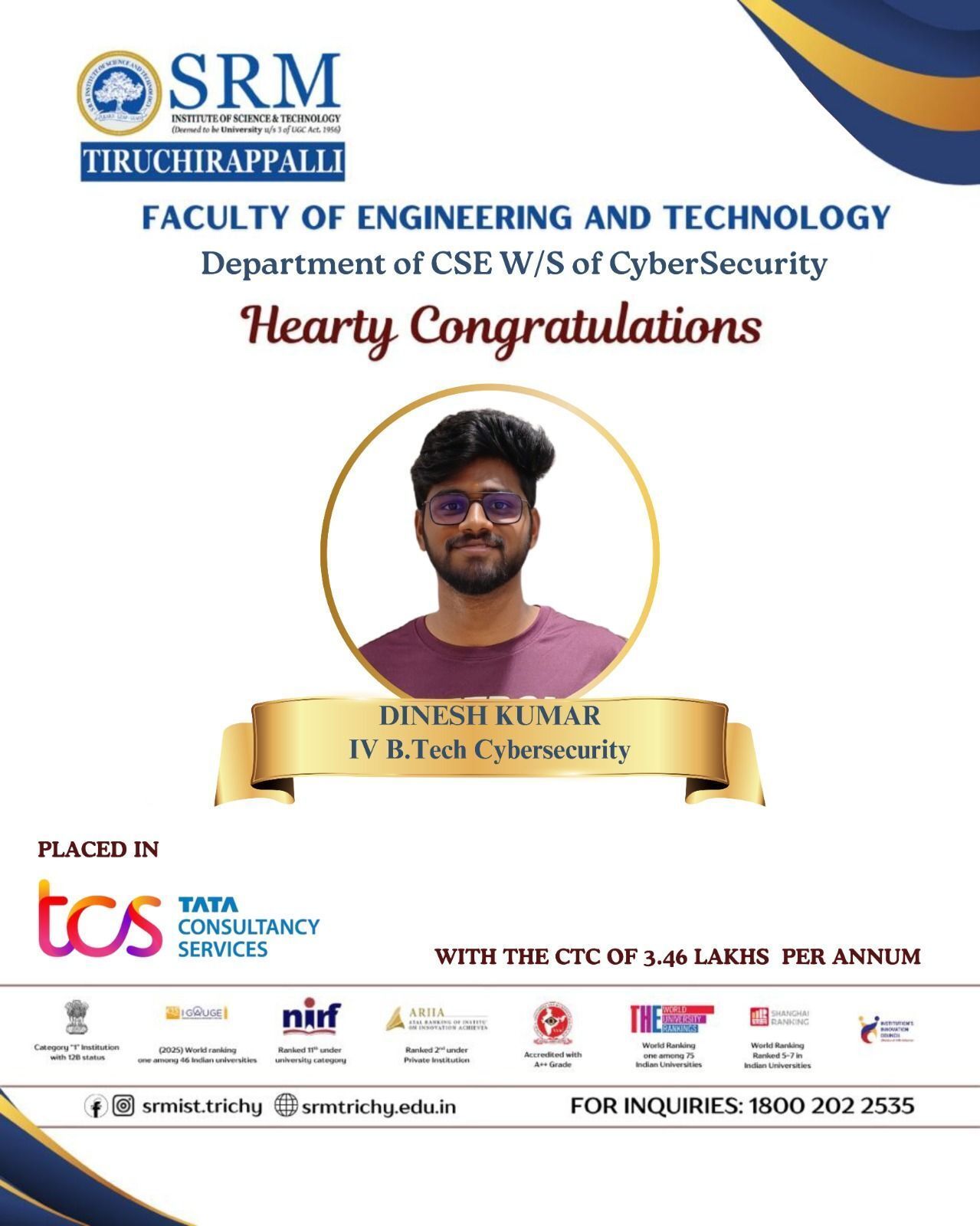 We are delighted to share that Mr. Dinesh Kumar, Final year B.Tech Cybersecurity student has been successfully placed at Tata Consultancy Services with a CTC of 3.46 LPA. This achievement reflects his dedication, consistency, and strong academic performance, truly embodying the values and academic excellence of SRMIST Tiruchirappalli. We wish him continued success and growth as he embarks on his professional journey