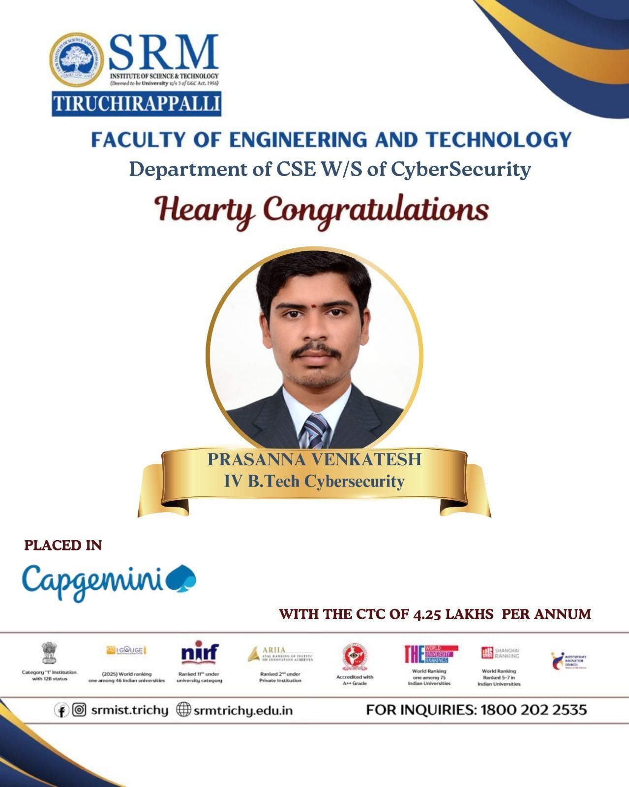 We are delighted to share that Mr. Prasanna Venkatesh, Final year B.Tech Cybersecurity student has been successfully placed in Capgemini with a CTC of 4.25 LPA. This achievement reflects his dedication, consistency, and strong academic performance, truly embodying the values and academic excellence of SRMIST Tiruchirappalli. We wish him continued success and growth as he embarks on his professional journey