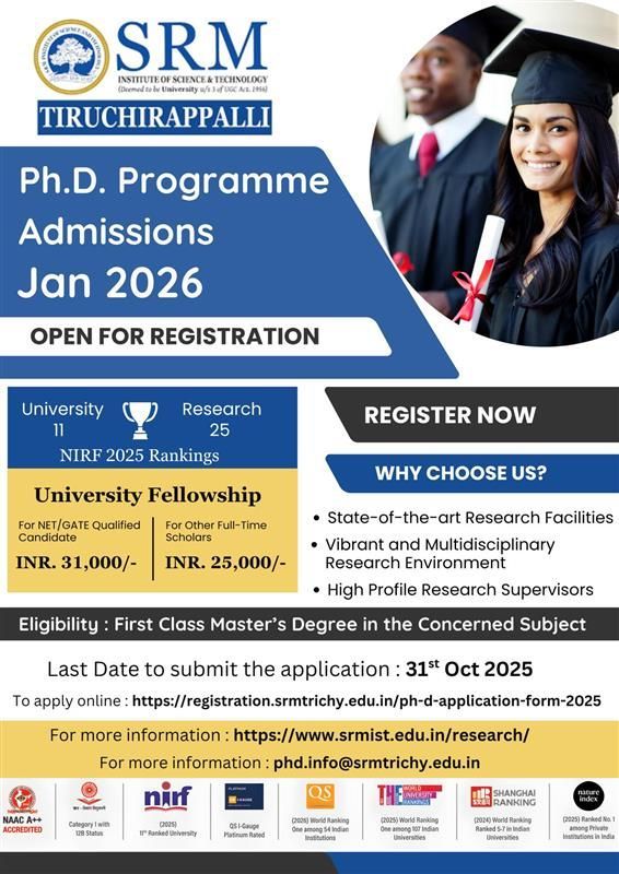 Embark on a transformative research journey with SRM Institute of Science and Technology, Trichy Campus! We are now accepting applications for our esteemed PhD Program for the January 2026 session.