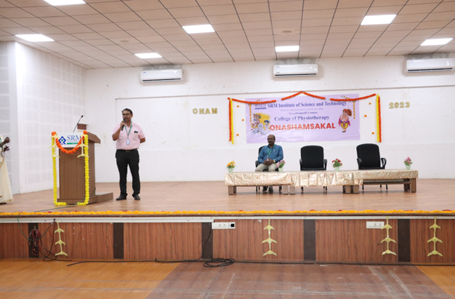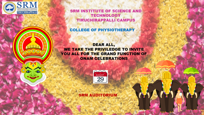 To commemorate the arrival of the Great King Mahabali, the College of Physiotherapy at the SRM Institute of Science and Technology, Tiruchirappalli campus organised an "Onam Festival" on August 29, 2023, at the SRM Auditorium. The Events was honoured by the chief guest Dr. Suresh, Dean Occupational therapy.