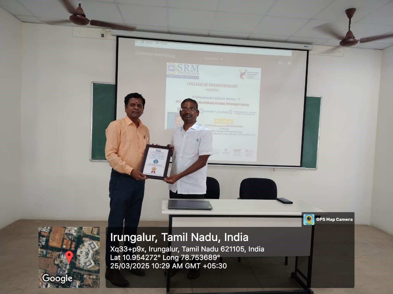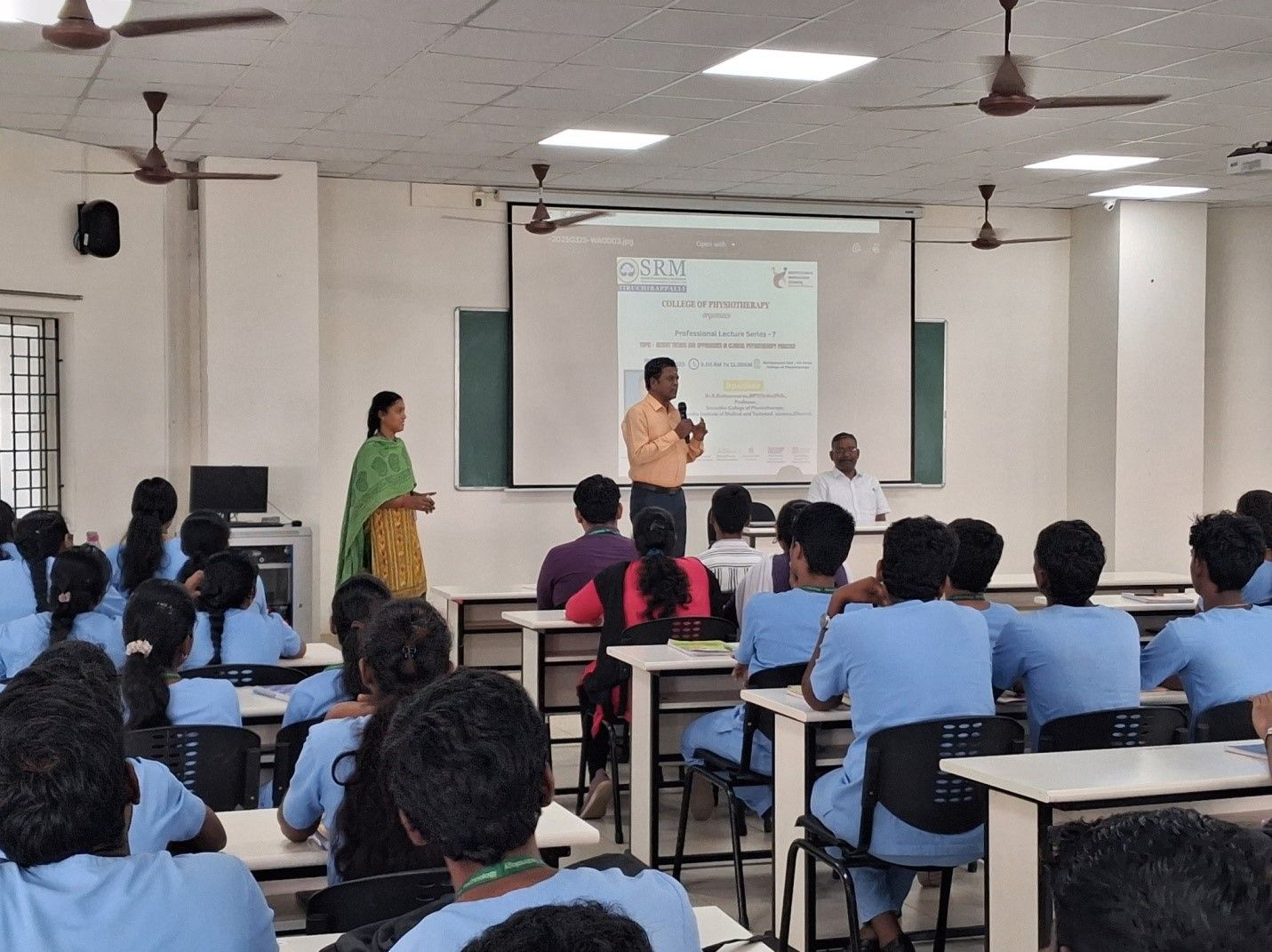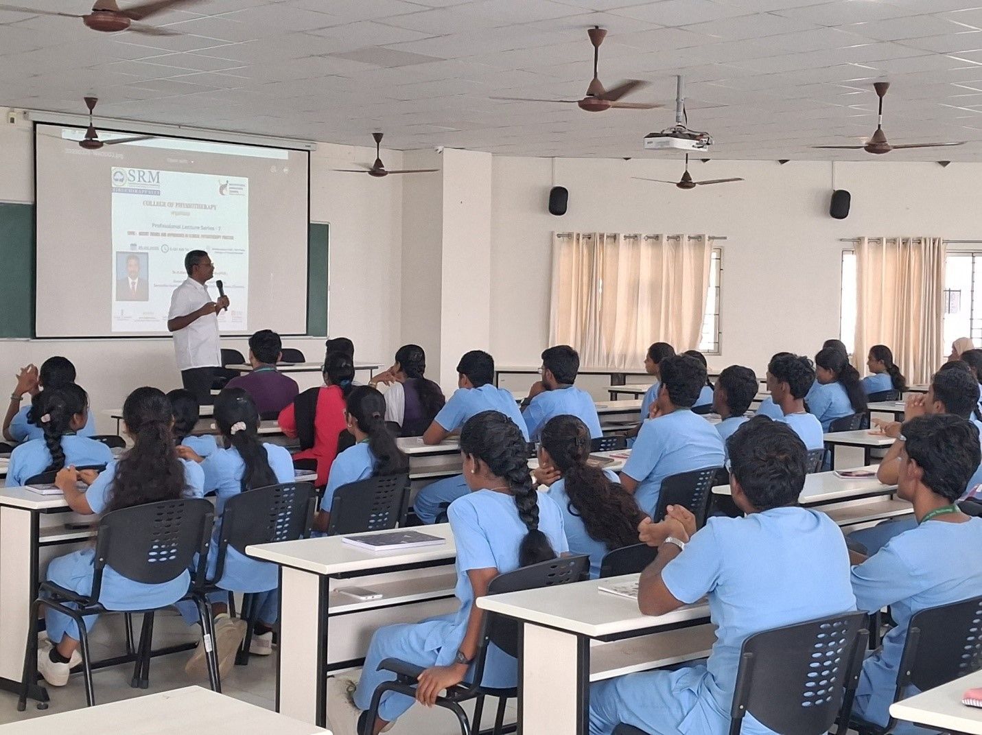 The Professional Lecture Series 7 was held on 25-03-2025 at multipurpose hall, College of Physiotherapy, SRM IST, Trichy. A Resource Person Prof. Dr. Koteeswaran, Saveetha Institute of medical and technical institutes, Chennai presented a topic on “Recent trends and approaches in Physiotherapy clinical practice”. The resource person emphasized the discipline, time management and how to do the diagnostic approach in clinical practices to Physiotherapy students. This session expanded the students’ knowledge of diagnostic approach and also encouraged them to adopt an integrated approach in their future clinical practices, making it a highly beneficial and stimulating learning experience.