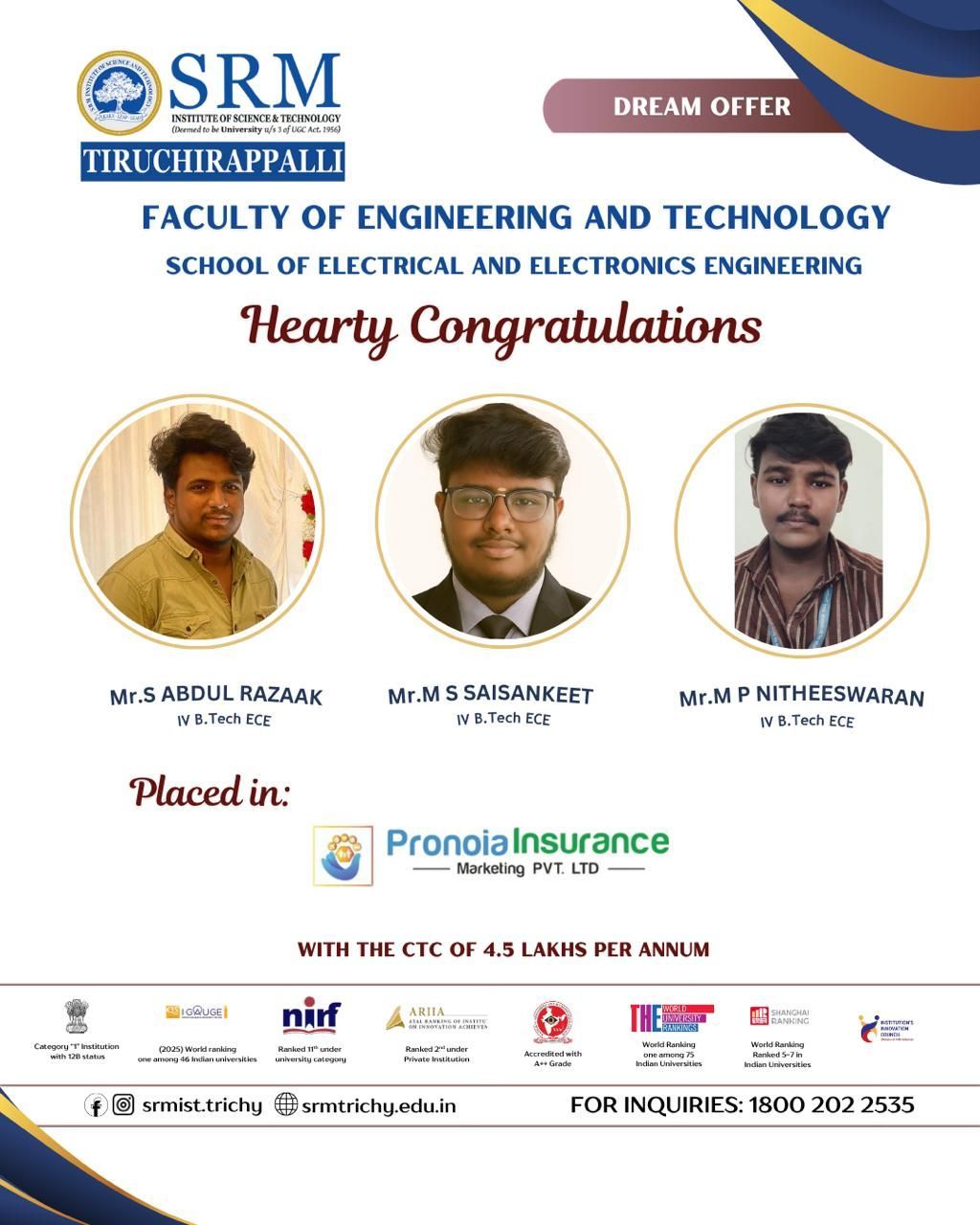 We extend our heartfelt congratulations to our ECE final-year achievers Mr. S Abdul Razaak Mr. M S Saisankeet Mr. M P Nitheeswaran for securing a Dream Offer at Pronoia Insurance Marketing Pvt. Ltd. with an impressive package of 4.5 LPA. Your success stands as an inspiration to your peers and a testament to the excellence nurtured at SRMIST. Wishing you the very best as you embark on this exciting new journey!