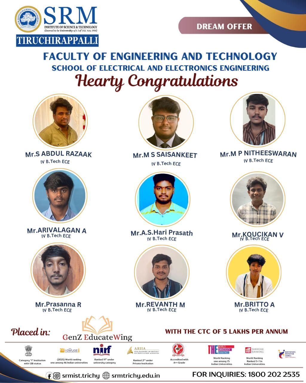 Hearty congratulations to our B.Tech ECE final-year students on securing their Dream Offer with GenZ EducateWing at a CTC of 5 LPA. S Abdul Razaak M S Saisankeet M P Nitheeswaran Arivalagan A A S Hari Prasath Koucikan V Prasanna R Revanth M Britto A Your hard work and dedication have paved the way for this success. Wishing you great heights in your professional journey!