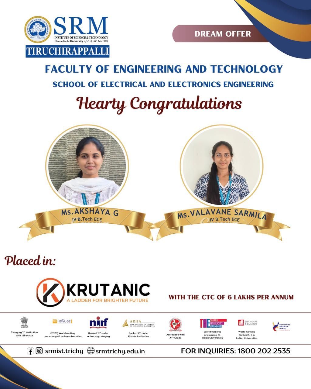The Faculty of Engineering and Technology, School of Electrical and Electronics Engineering, SRMIST Tiruchirappalli is proud to congratulate Ms. Akshaya G and Ms. Valavane Sarmila (IV Year, B.Tech ECE) on being successfully placed in Krutanic with an impressive CTC of 6 LPA. Wishing them continued success and a bright future ahead!
