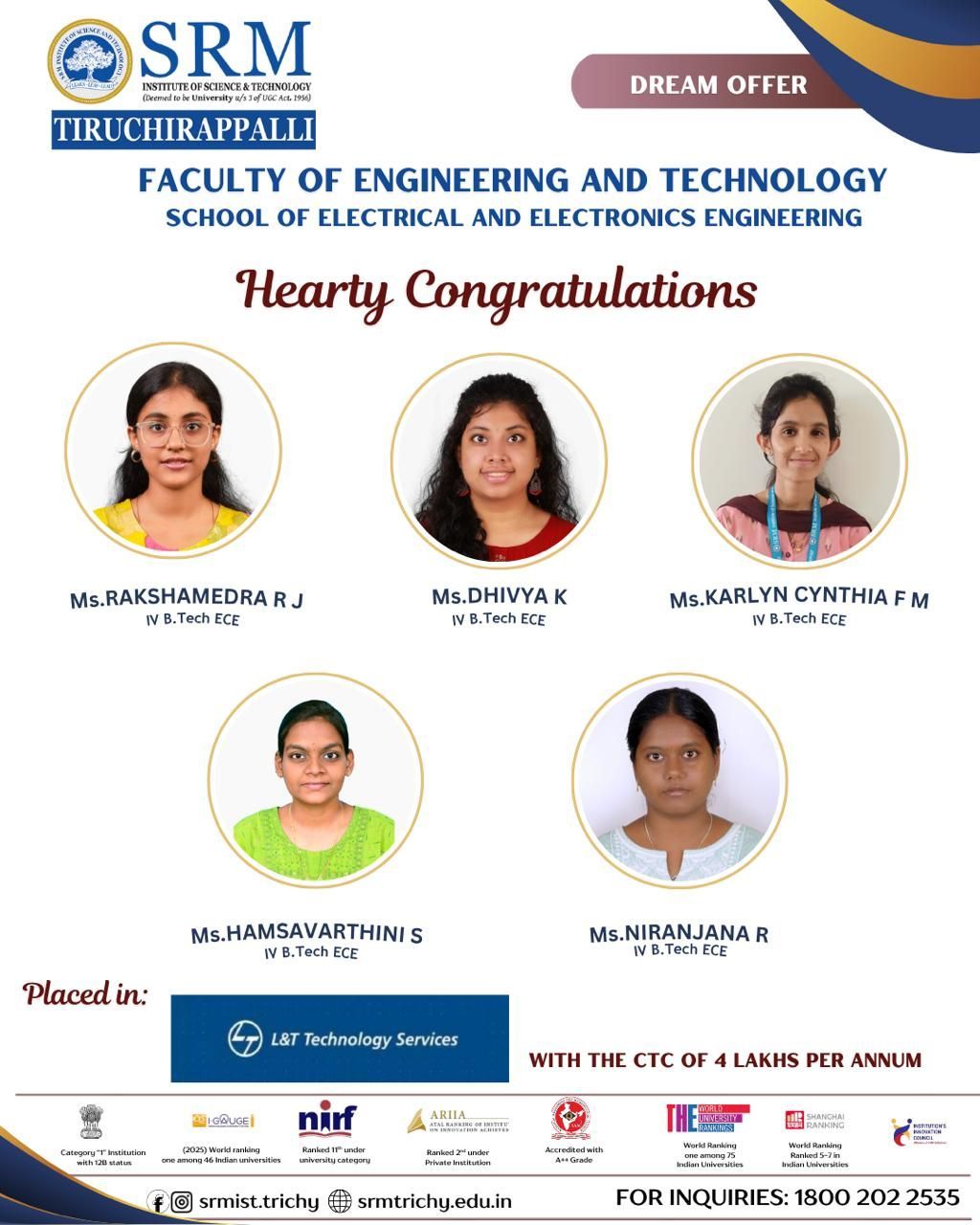 Ms. Rakshamedra R J, Ms. Dhivya K, Ms. Karlyn Cynthia F M, Ms. Hamsavarthini S, and Ms. Niranjana R — for securing their Dream Offer with L&T Technology Services at a CTC of 4 LPA. 🎉