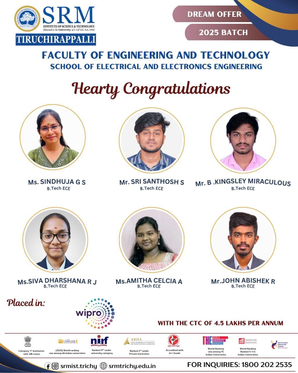 Hearty congratulations to our talented ECE students Ms. Sindhuja G S, Mr. Sri Santhosh S, Mr. B. Kingsley Miraculous, Ms. Siva Dharshana R J, Ms. Amitha Celcia A, and Mr. John Abishek R for securing their Dream Offer with Wipro at a CTC of 4.5 LPA. Your dedication, determination, and excellence have paved the way for this remarkable achievement. Wishing you continued success as you embark on your professional journey.