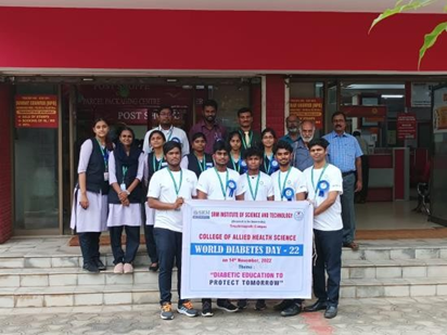 The college of Allied Health Science, Faculty of Medicine & Health Science, SRM Institute of Science and Technology has organized outreach program on “Diabetes” in view of “World Diabetes Day-22” on 14th November 2022 (Monday) at Head Post Office, Trichy between 2.00 pm to 4.00 pm. The theme of the program was make an awareness on “EDUCATION TO PROTECT TOMORROW” combine with “ACCESS TO DIABETES CARE” among the post office employers and public communities about the pre and post check up, precautionary measures, diagnosis and diet maintenance.
